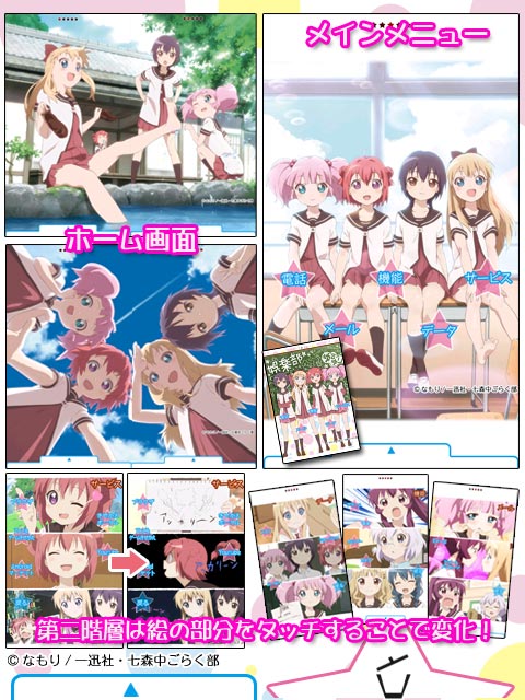 ちなつ,京子,結衣…がアンドロイドのケータイメニューで可愛さ大爆発! あ、忘れず言おうよ\アッカリーン/ au ISシリーズから対応開始。詳細はHPをご覧ください。http://kst.ilogos.co.jp/?m=oth_styy_index商品名 ゆるゆり-きせかえtouch- 発売元 株式会社アイロゴス 発売日 9/2 価格 525円