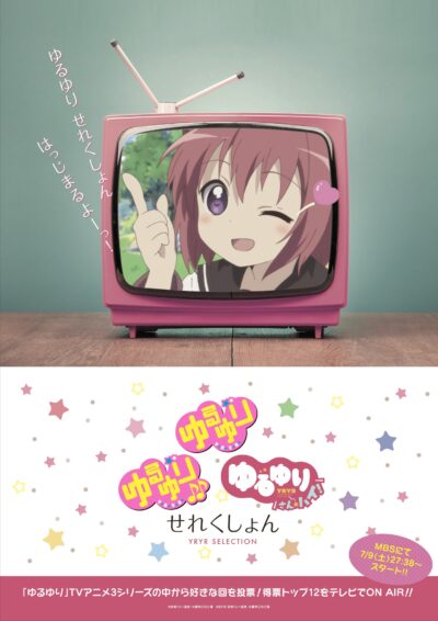 2022.6.10 ニュース MBSにて「ゆるゆりせれくしょん」放送決定! 「ゆるゆり」シリーズの再放送がMBSで決定! 放送内容は…皆さんの投票で決まります! TVアニメ3シリーズ全36話の中から好きな回に投票し、 その得票数トップ12をテレビでON AIRいたします。 投票方法はTwitterにて告知します。お楽しみに!!